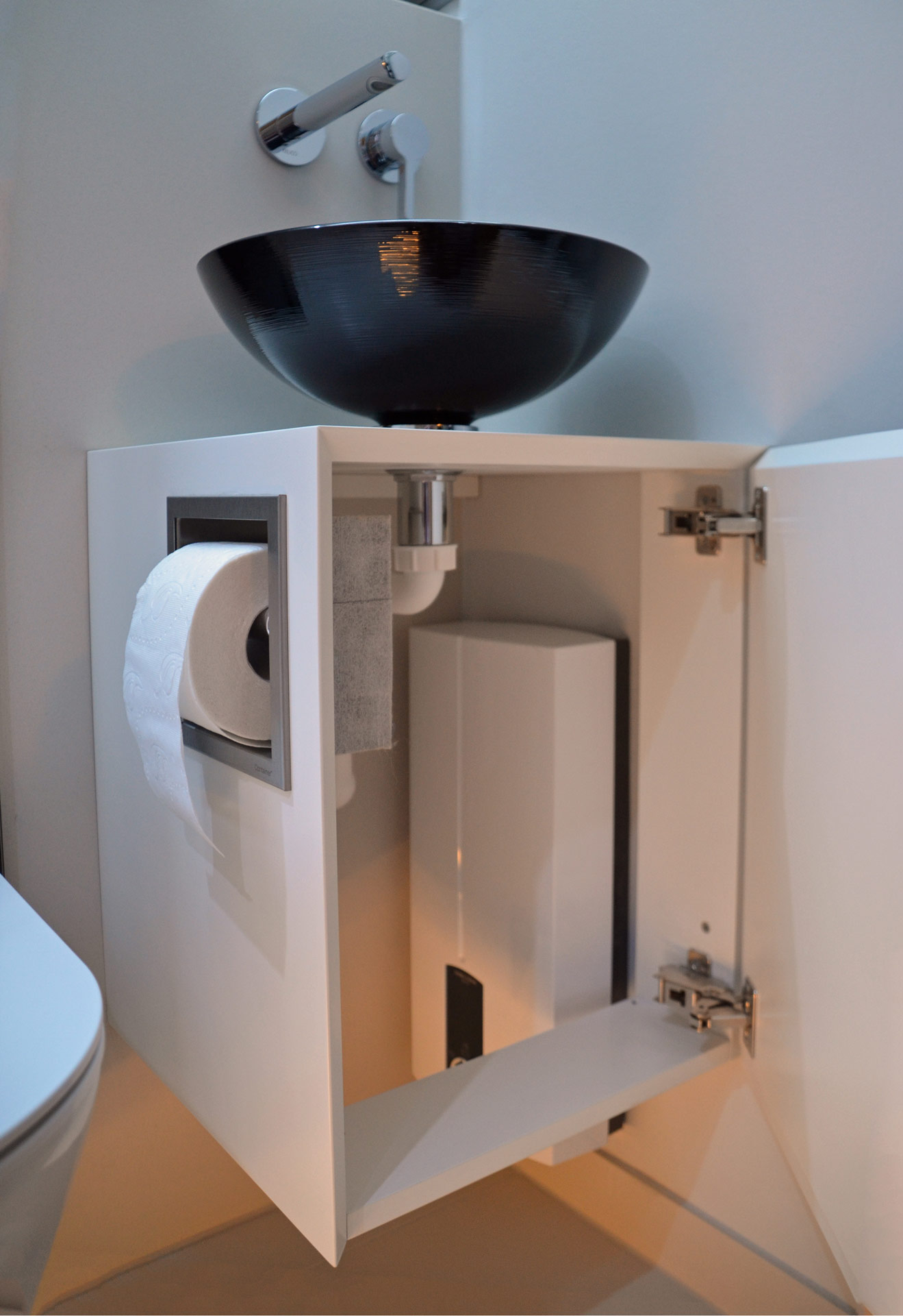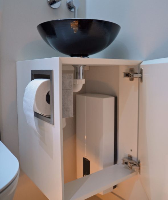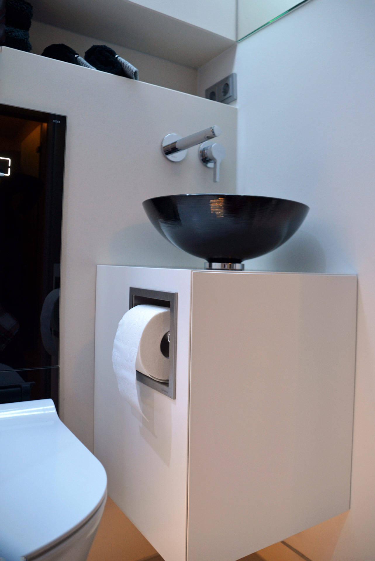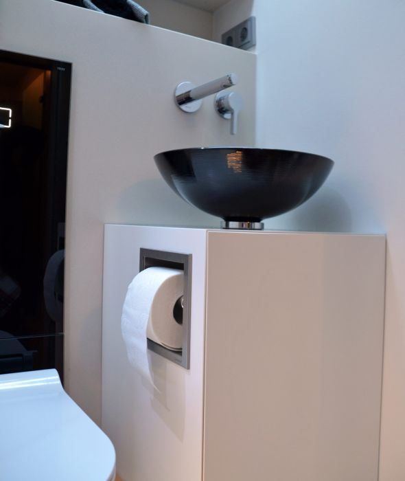 Unter der Glasschale, die mit den passenden Wandarmaturen kombiniert ist, übernimmt ein individuell entworfener Holzwürfel mehrere Funktionen. Er trägt die Glasschale ebenso wie den eingebauten Toilettenpapierhalter und versteckt den noch benötigten Durchlauferhitzer hinter der auf Gehrung geschnittener Holztür. Viele Funktionen die sich optisch hinter weiß lackiertem Holz schlicht zurücknehmen.