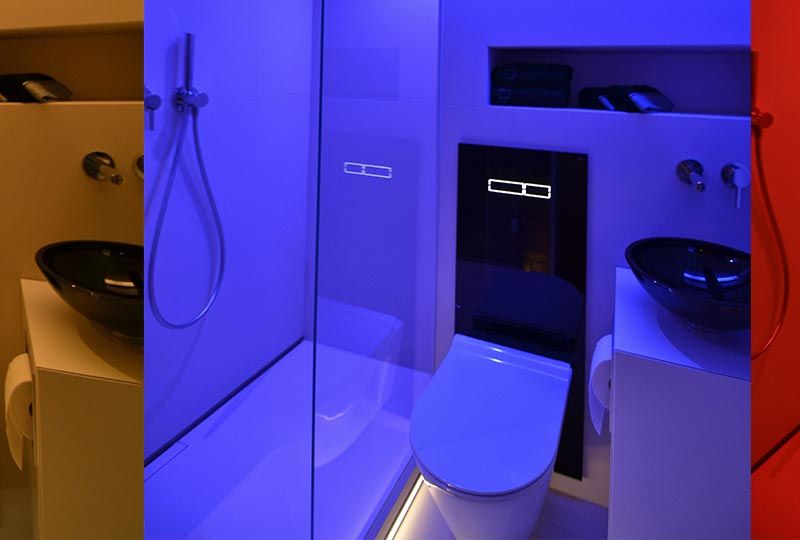 Als Krönung im Raum spielt die Lichttechnik eine große Rolle. Der kurze Besuch in dem Raum wird durch die automatisch geschaltete Lichtleiste im Untertritt des Duschpodestes begleitet. Der warme Lichtschein fließt über den Boden, zeigt den Weg und unterstreicht das Podest. Zeitgleich sind die kleinen Spots in der Shampoonische geschaltet, die die Kupferfliesen extra in Szene setzen.