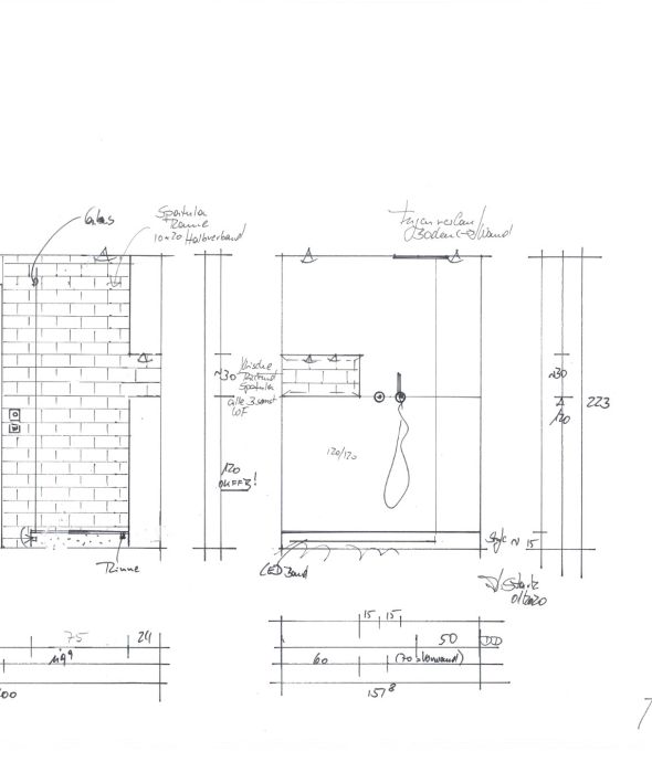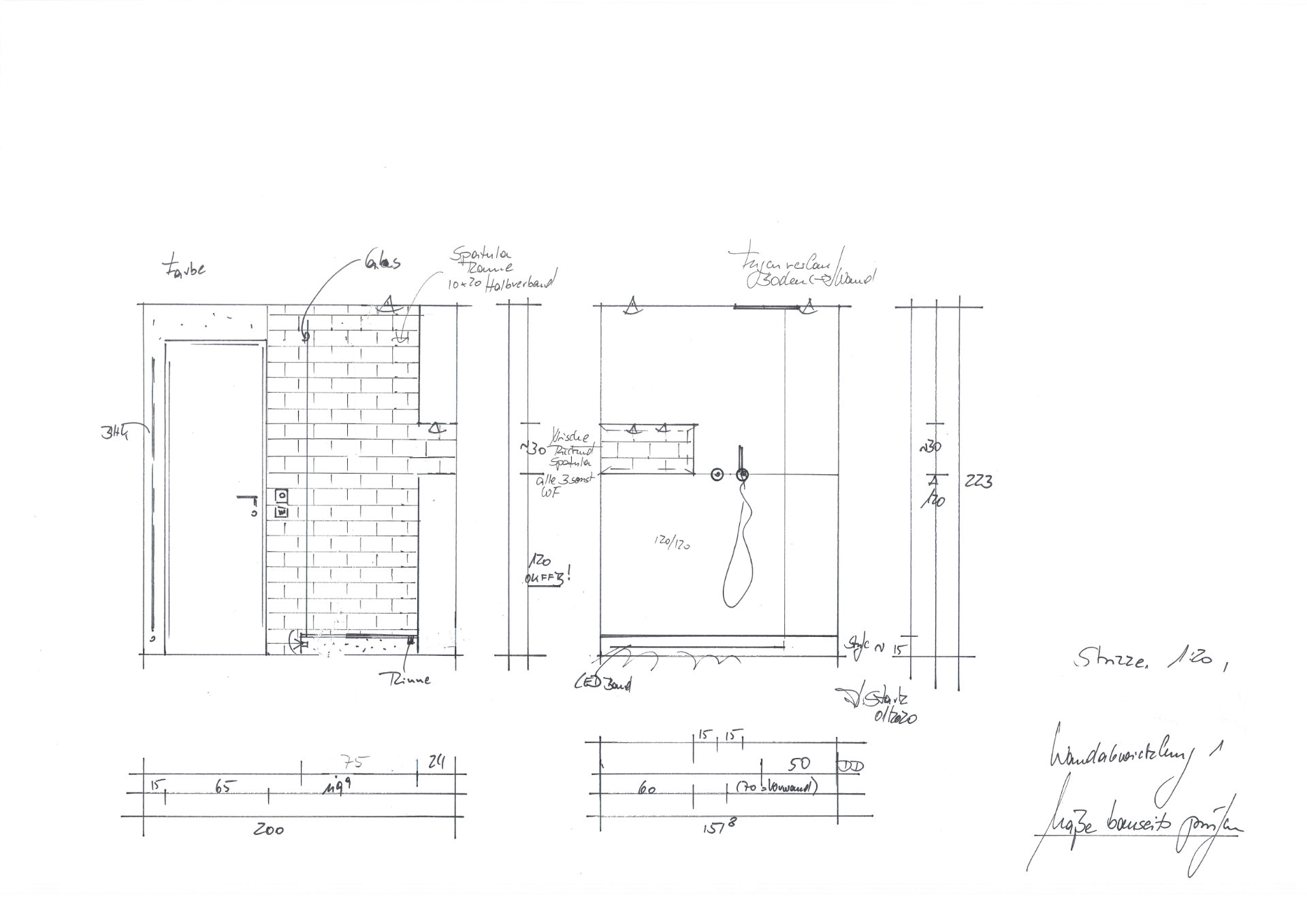 Eine breite Nische – beginnend an der gleichen Unterkante wie die Duschnische – dient als Ablagefläche. Quer spannt sich eine Aufbauleuchte in 100 cm Breite, die die Höhe des angedachten Spiegels von 60cm begrenzt. Dieser verläuft auch an der rechten Wandseite bis hinter den Heizkörper hindurch. Während der Bauphase wird kurzerhand entschieden, dass der über dem Becken befindliche Spiegel entfallen soll, um die wunderbar wirkende Fliesenwand nicht in ihrer Wirkung zu unterbrechen.
