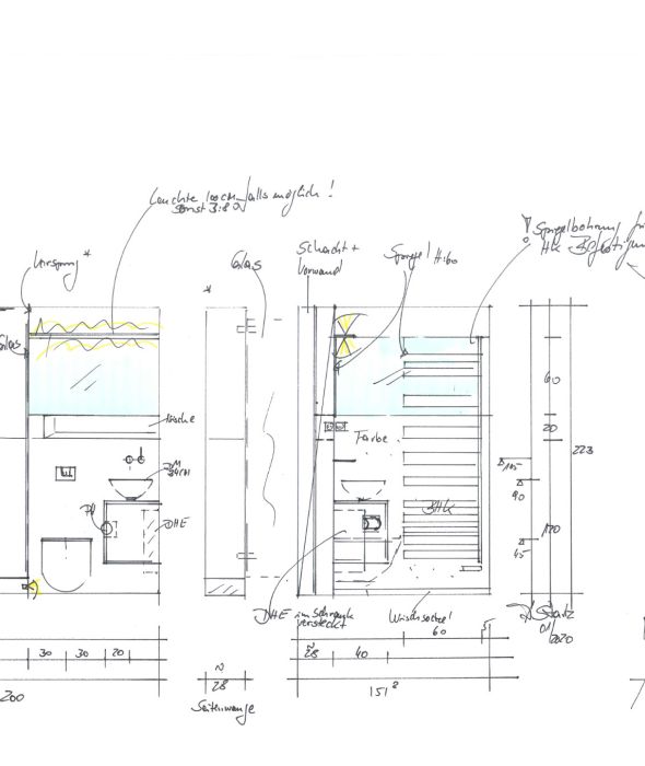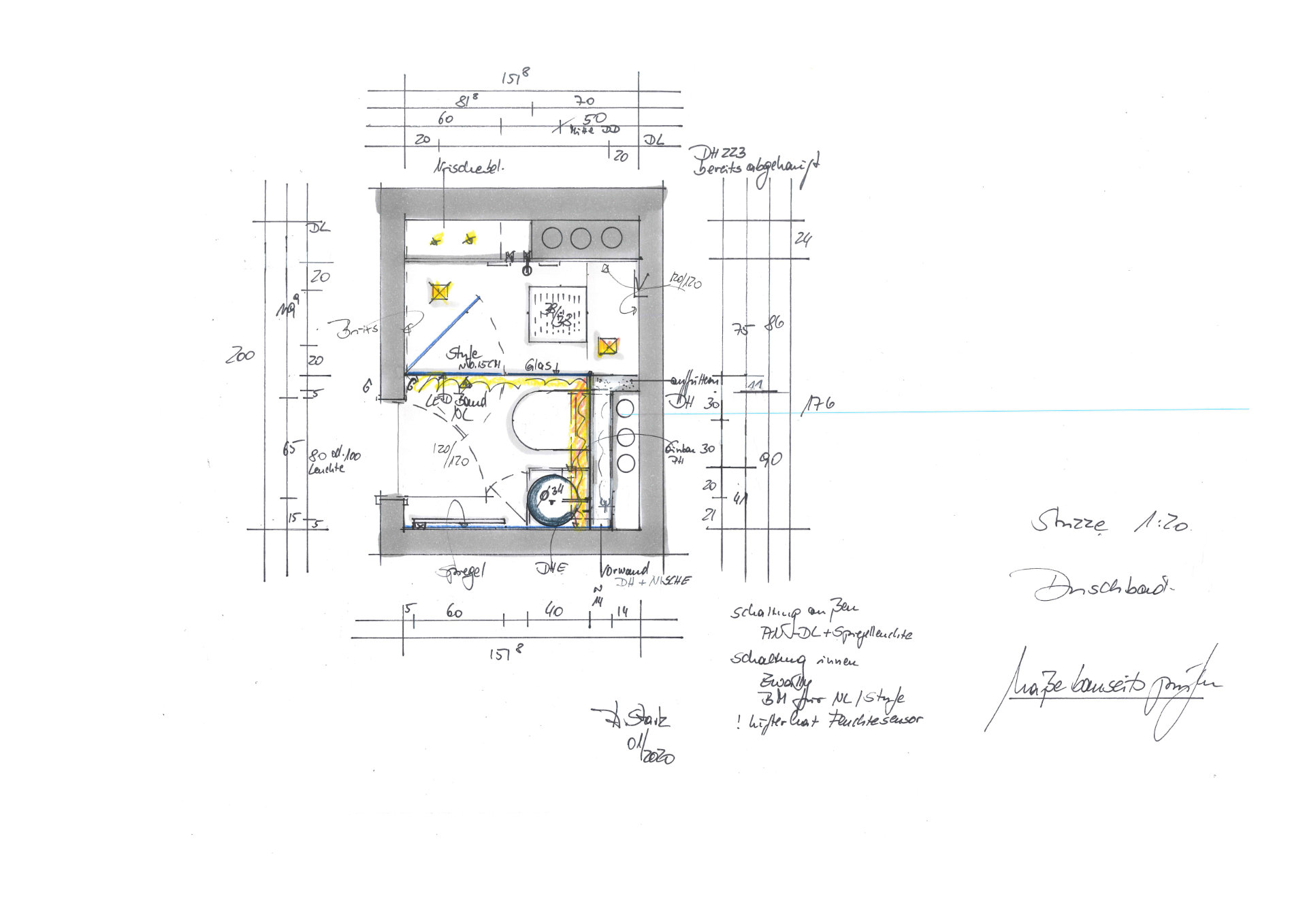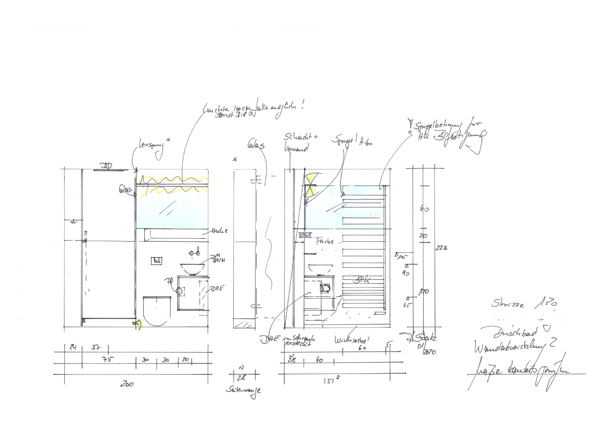 Das Gäste-WC hingegen, das im täglichen Leben des Eigentümers eine untergeordnete Rolle spielt, ist eigentlich recht großzügig geschnitten. Um eine Lösung zu finden, die dem heutigen Standard und den gehobenen Ansprüchen des Bauherrn genügen kann, werden beide Räume unter die Lupe genommen und eine neue Idee entsteht.