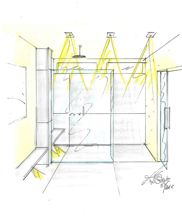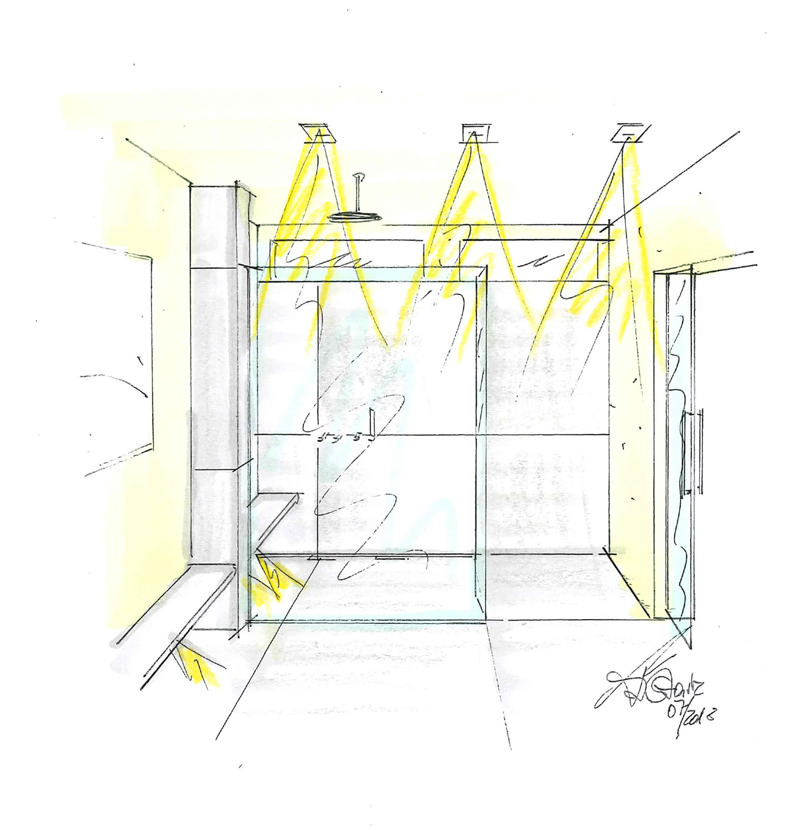 An der hinteren Wand befindet sich ein unveränderbarer Kaminschacht. Er wird etwas aufgedoppelt und gestalterisch in das Einrichtungskonzept integriert, indem sich eine raumbreite Sitz-/Ablagebank in gleicher Tiefe von 30 cm daran anschließt. Zusätzlich wird aus Trockenbau eine kleinere Säule in gleicher Tiefe erstellt, die die Glaswand mittig aufnimmt – somit werden unnötige Ausschnitte im Glas umgangen – und zur Duschseite hin einer recht kleinen aber ausreichenden und beleuchteten Shampoonische ihren Platz bietet. Unter der Bank befindliche LED Leuchten lassen ihren Lichtstrahl über die großformatigen Fliesen gleiten und setzen die Gestaltungsidee ins rechte Licht.