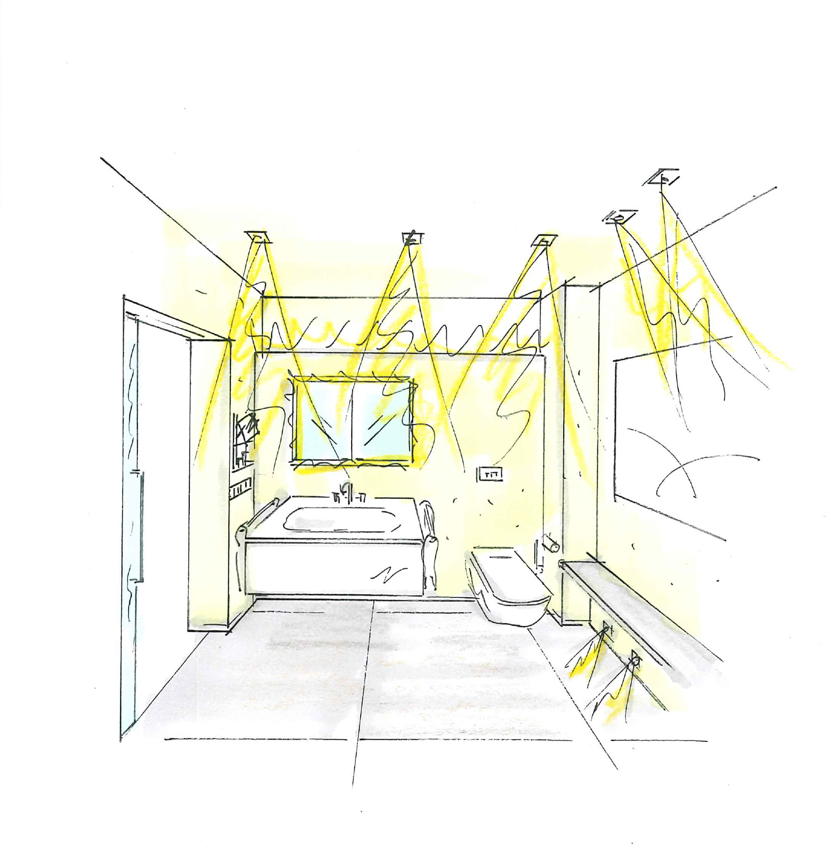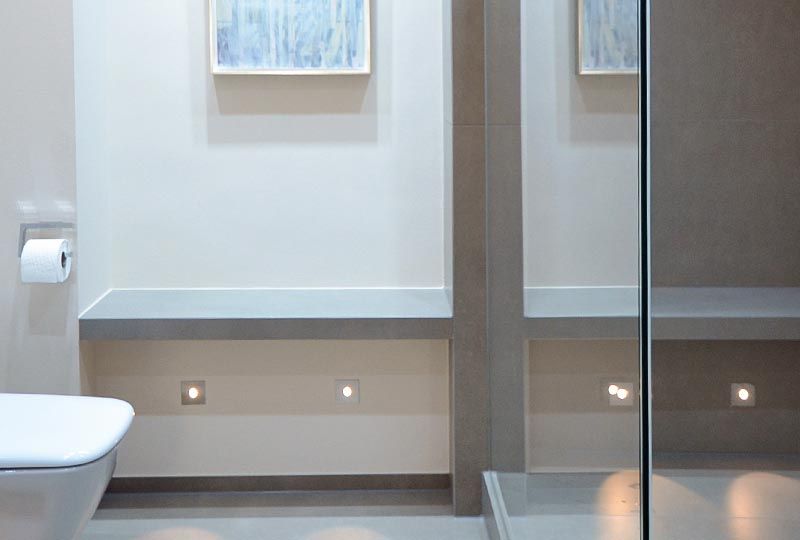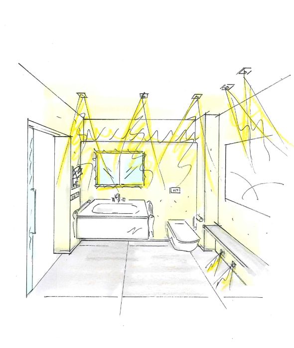An der langen Vorwand sorgen zwei bodennah montierte Wandleuchten für ein automatisch geschaltetes Nachtlicht – per Bewegungsmelder gesteuert. Da es sich hier um einen fensterlosen Raum handelt, ist dieser Lichteffekt bei jedem Betreten des Raumes ein schönes welcome. Da der Raum nun eine Doppelnutzung zu erfüllen hat, wird eine Abhangdecke eingezogen um hier drei Einbauspots zu integrieren die eine gute Lichtgestaltung für die Nutzung der Waschmaschine liefern können.