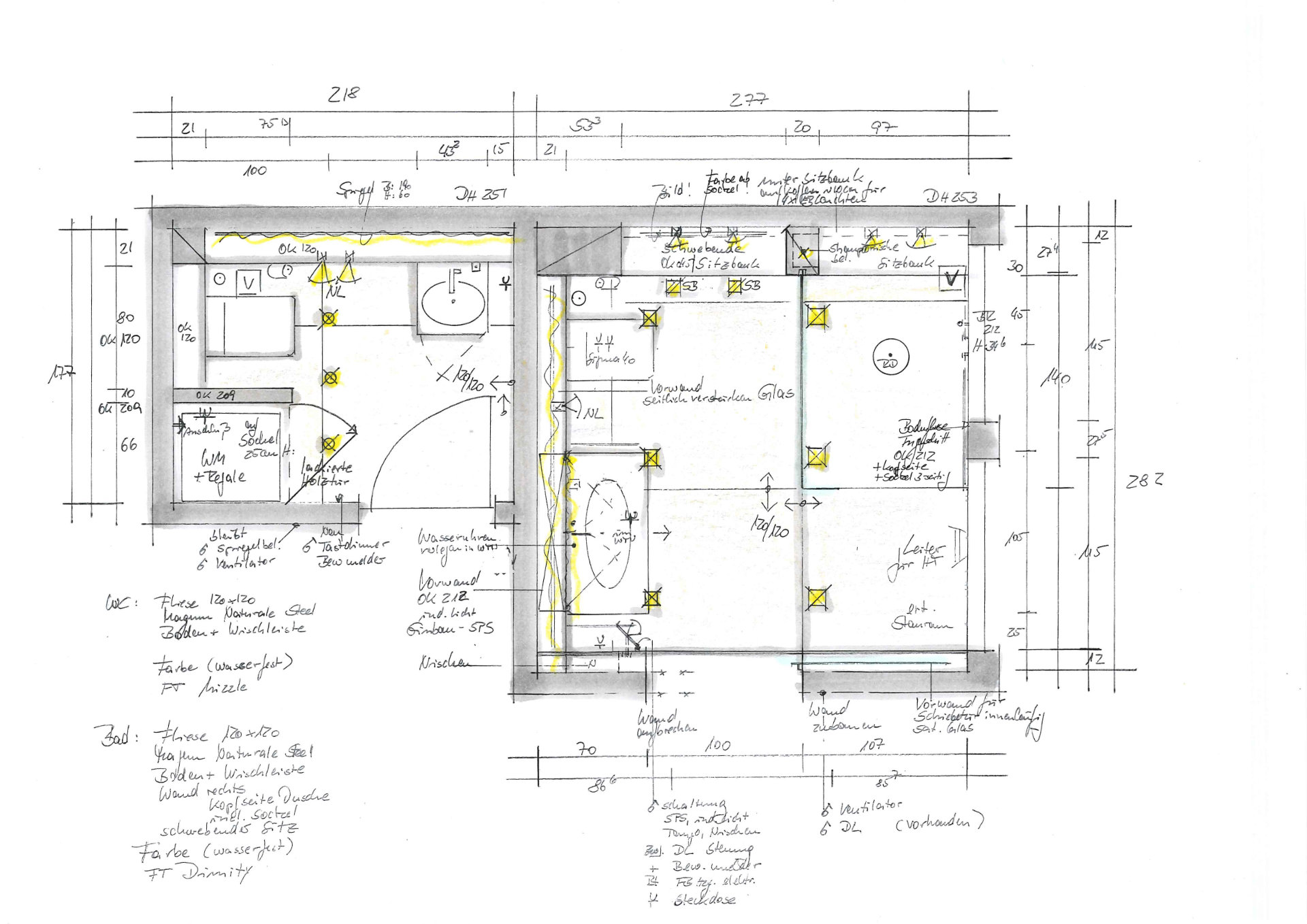 In dem neuen Bad findet eine raumgreifende Duschzone ihren Platz und ersetzt die bisherige Badewanne. In dem Zuge möchten die Bauherren auf eine komfortable und vorausschauende Einrichtung achten die in allen Lebenslagen ihren Bedürfnissen entsprechen kann.