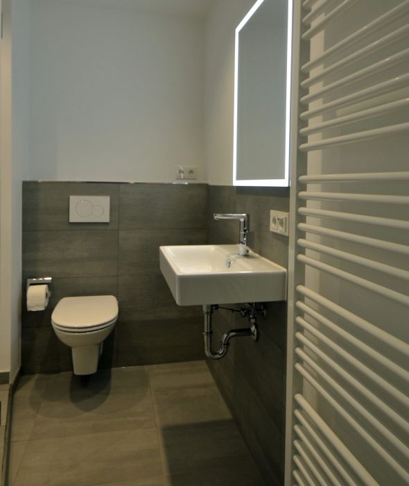 Auf nur 4 m2 Grundfläche entstand durch kluge Raumnutzung und -gestaltung ein praktisches Mieter-Duschbad, das trotz beengter Platzverhältnisse ein Gefühl von Freiraum und aufgeräumter Modernität vermittelt.
