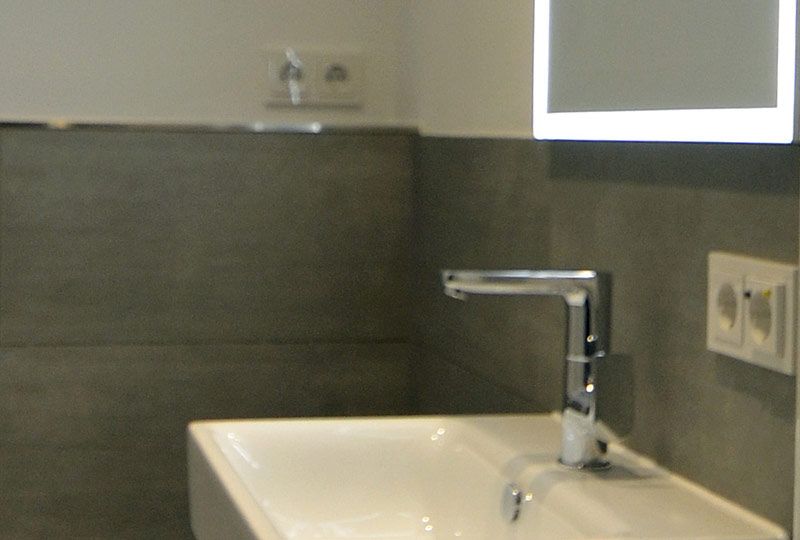 Ein frei gestalteter Gefälleestrich ermöglicht einen Duschbereich von 100 x 80cm und zusätzlichen Platz bis zur nahegelegenen Raumecke. Die angepasste Glaswand mit schwenkbarem Element kommt einer frei zugänglichen Duschzone sehr nahe. Für optische Größe sorgen die großformatigen, hellen Wandfliesen im Format 90 x 30 cm, die auf der Kopfseite nur waagerechte Fugen ermöglichen. Ein spannender Kontrast zu den Feinsteinzeugfliesen in Grau die, den Boden und – halbhoch – auch zwei angrenzende Wände bekleiden.