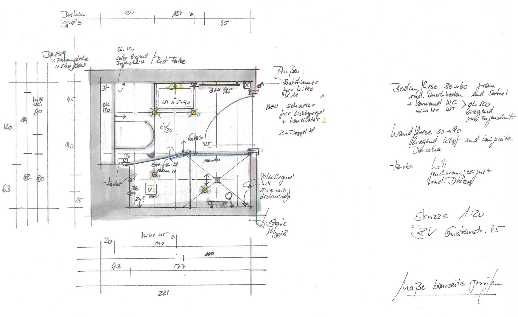 Auf nicht einmal 4 m² Grundfläche soll die Badewanne gegen eine möglichst große Dusche getauscht werden, ein WC seinen Platz finden und ein Waschtisch angebracht werden, kombiniert mit ausreichend Stauraum. Eine moderne und aufgeräumte Ausstrahlung ist gewünscht, als Farben sind Grau und Weiß angedacht.