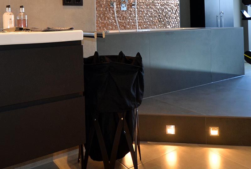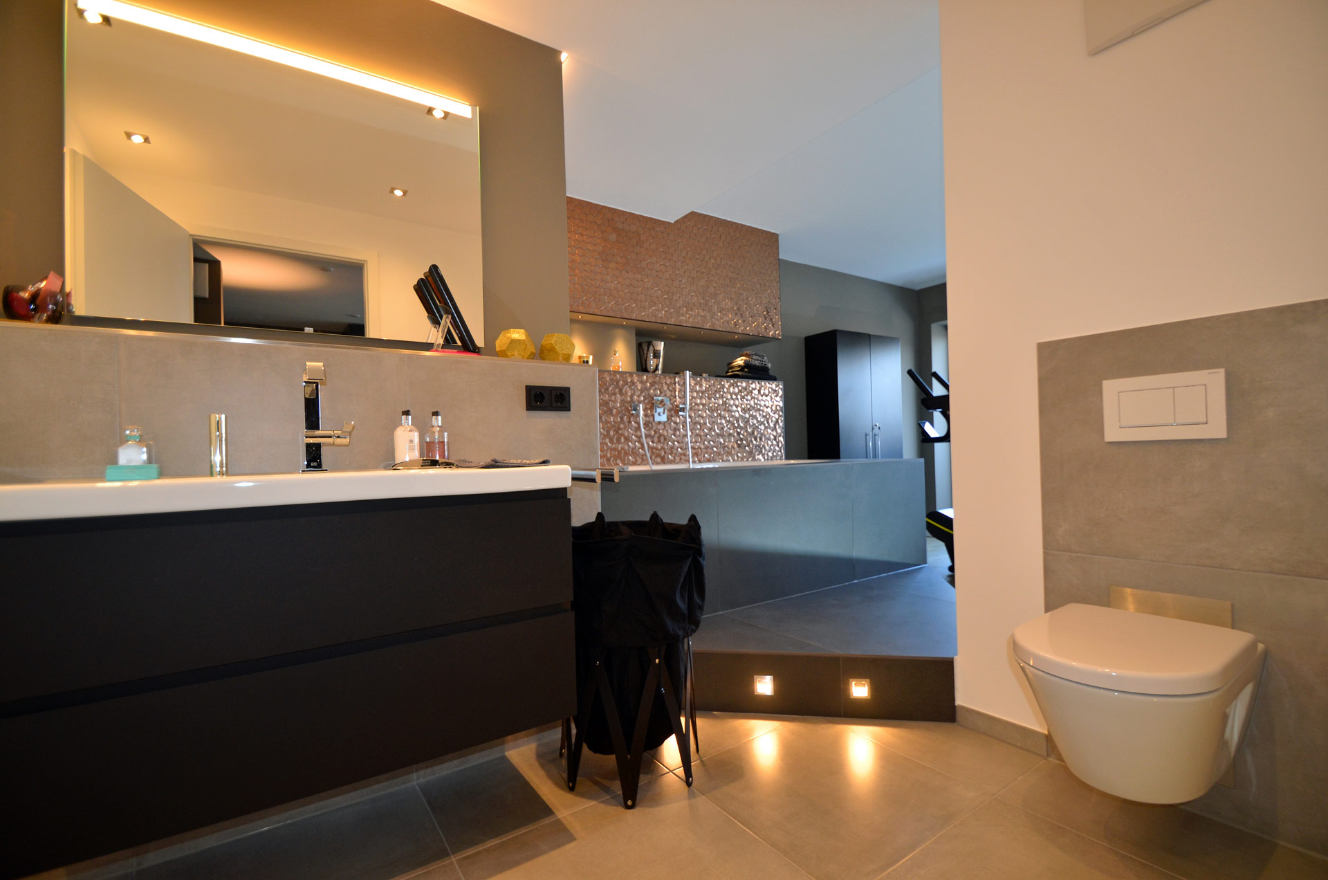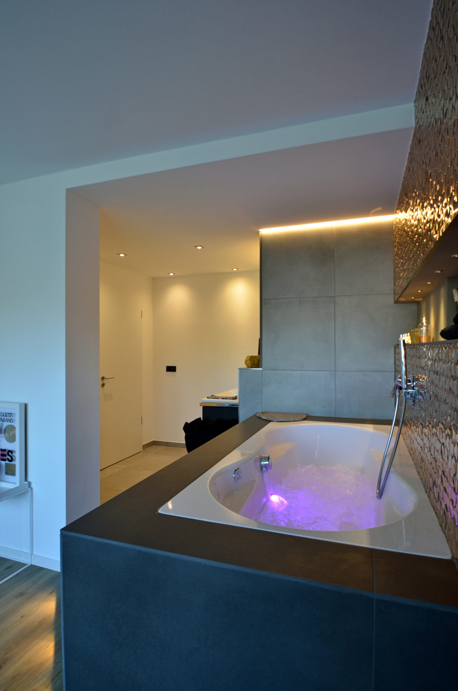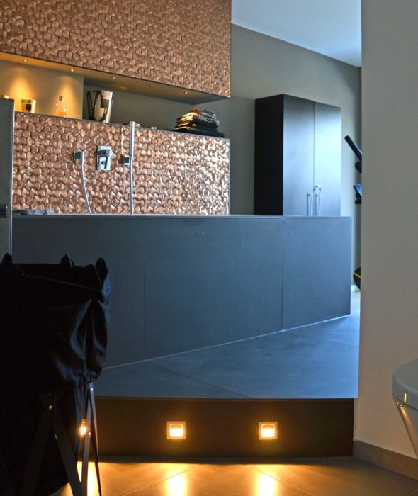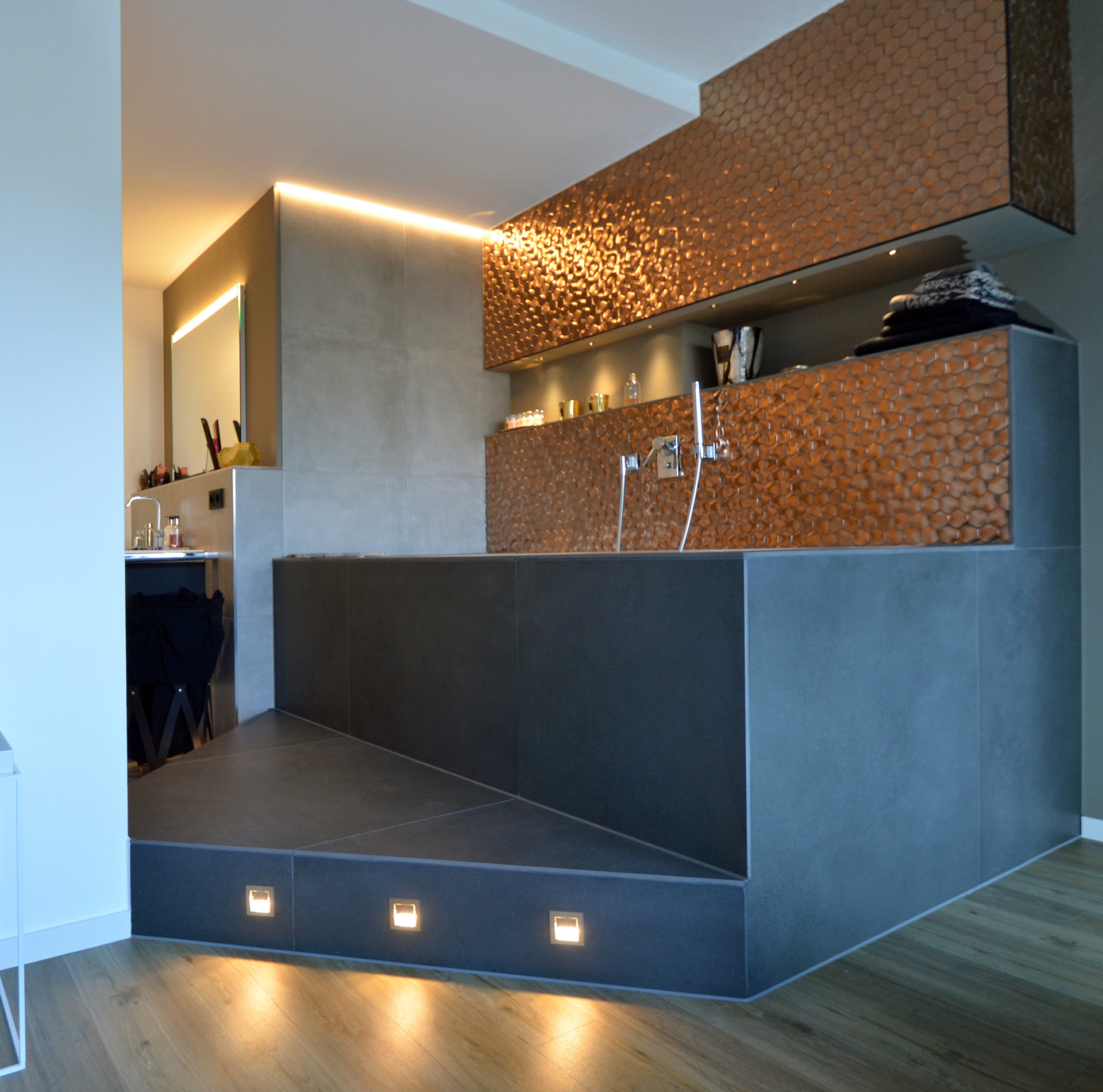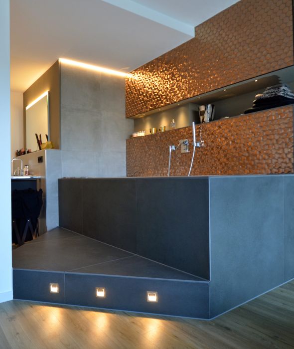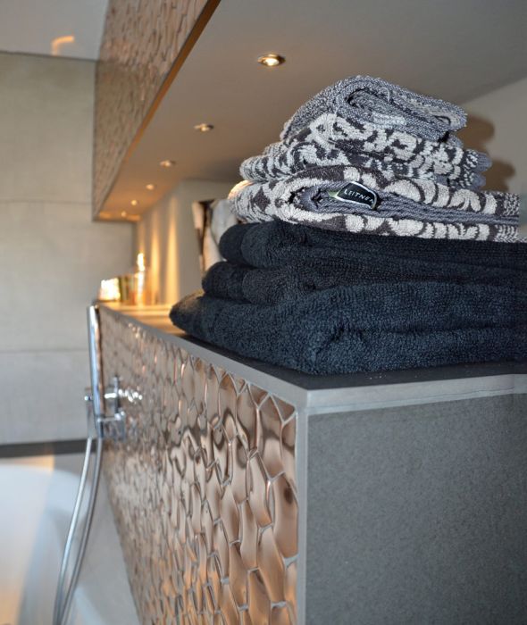 Die Fliesengestaltung mit großformatigem, schwarzem Feinsteinzeug und einem kupferfarbenen Metallmosaik spiegelt den Bauherrengeschmack wider, ganz im Einklang mit den vorhandenen Elementen in Betonoptik. Das Resultat ist ein gelungenes Gesamtbild und ein wunderschönes Ambiente für ein entspannendes Wannenbad mit Blick auf die Schlosskulisse in unmittelbarer Nähe.
