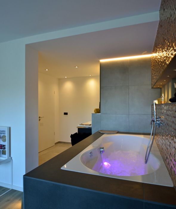 Um den komfortablen Pool herum, zieht sich eine dreiseitige Ablagefläche zum Schauen, zum Sitzen und Ablegen, Dekorieren schöner Dinge. Das Bad im Pool mit wohltuender Unterwassermassage wird durch eine Farblichtbeleuchtung in der Wanne selbst zum sinnlichen Erlebnis.