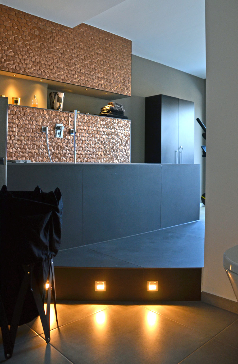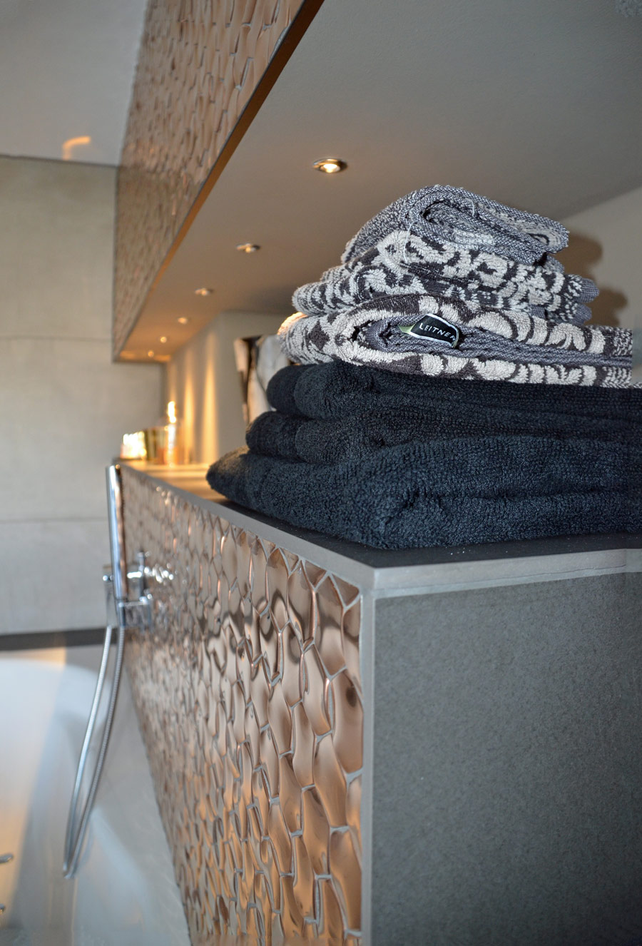 Eine deckenhohe Vorwand mit durchgehender Ablagenische hinter dem Pool birgt nicht nur die Wasserinstallation, sondern retuschiert auch die unterschiedlichen Raumtiefen. Das außergewöhnliche Kupfermosaik zieht den Blick magisch an und reflektiert liebevoll die eintretenden Sonnenstrahlen.
