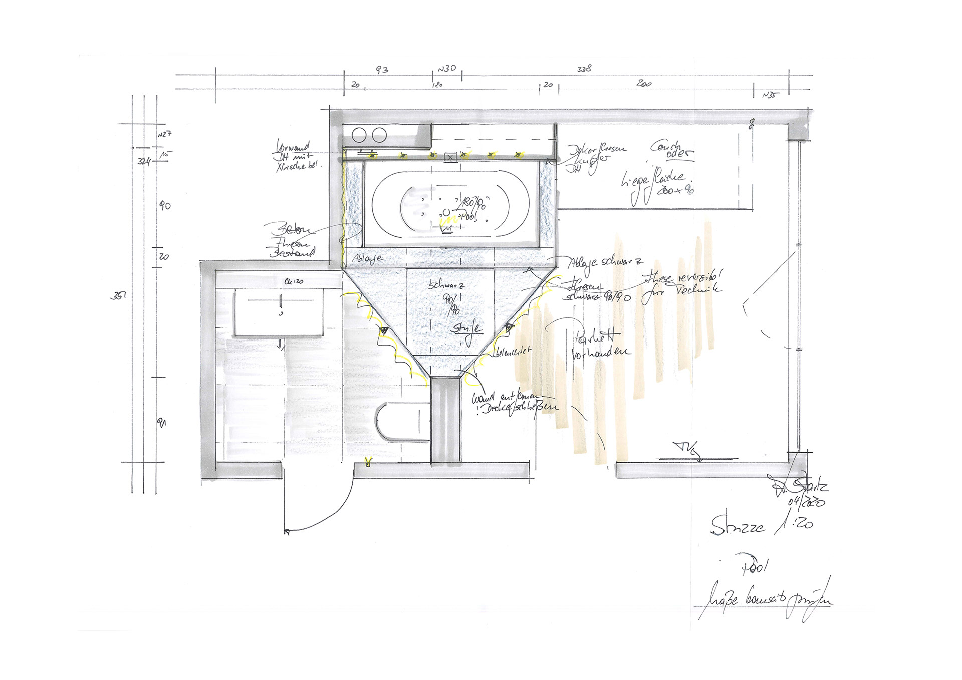 Um den Blick auf das naheliegende Schloß aus der Badewanne heraus zu gewähren, muss die Zwischenwand zum Gästezimmer teilweise entfernt werden. Das Badezimmer vergrößert sich dadurch erheblich und wird zusätzlich als Sportzimmer um deklariert. Zwei Dinge die gut zusammen passen – wenn das Bad einen entsprechenden Charakter innen hat.
