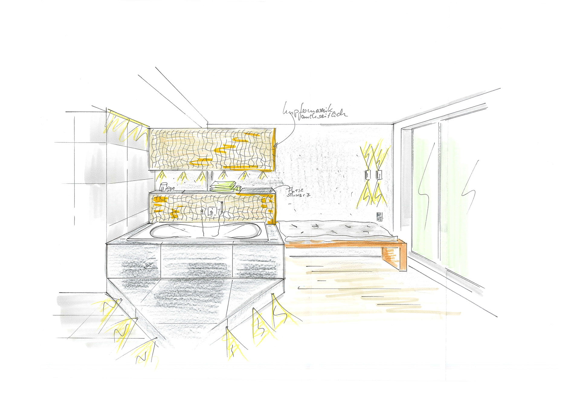 Nachdem alle Möglichkeiten der Integration einer Whirlwanne in eine vorhandene Raumnische durchgespielt worden sind, wird noch einmal neu gedacht: Mit einem unverstellten Blick aus der Wanne heraus ließe sich das Badeerlebnis noch entspannender zu gestalten!