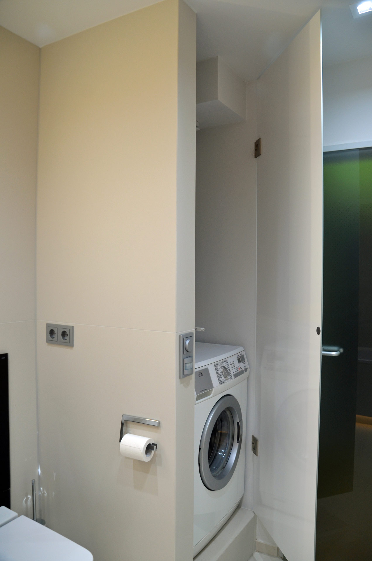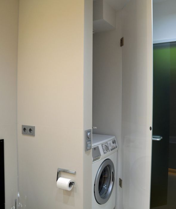 Um nun auch die Waschmaschine, den Durchlauferhitzer und die Wasserzähler verstecken zu können, wird eine deckenhohe Trockenbauwand direkt am Anfang des Raumes eingestellt. Die Wand wird mit der Fliese in Fugenschnitt belegt und verwandelt sie somit in ein Gestaltungselement. Zur Wanne hin sind Steckdosen vorbereitet um ein TV integrieren zu können. Eine Glastür wird bündig eingepasst und in der Wandfarbe lackiert, sodass der praktische Hauswirtschaftsraum auch optisch keine Einschränkung darstellt.