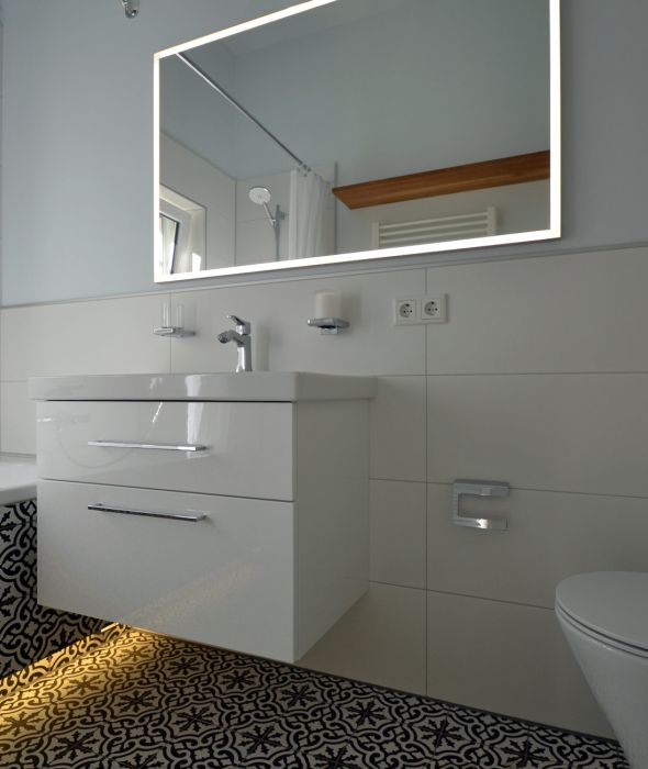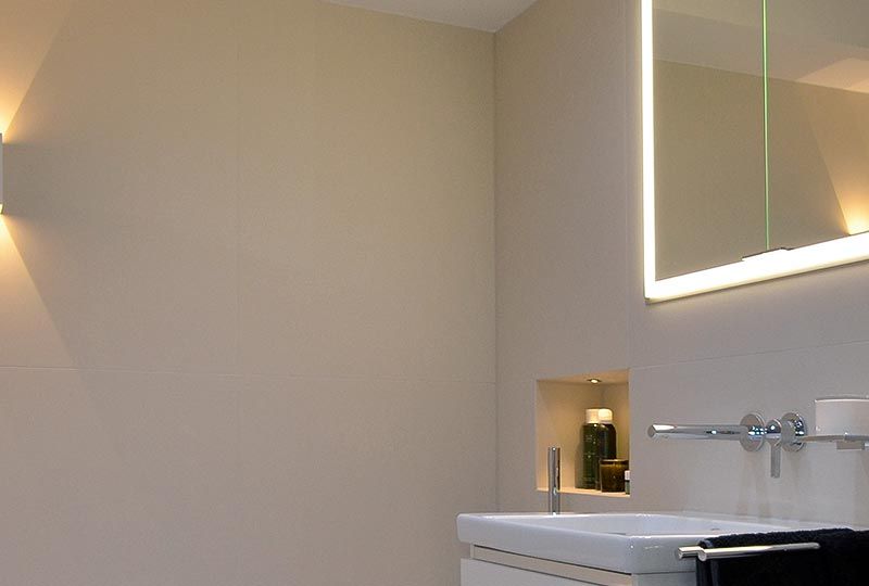 Das Modell wird mit integriertem Licht gewählt um beim entspannten Baden die Lichtreflexionen im Wasser und an der Decke gespiegelt genießen zu können. Zusätzlich spenden zwei Wandleuchten ein angenehmes warmweißes Licht zu allen Ritualen im Bad. Der beleuchtete Untertritt der Wanne erleichtert ein Herantreten, setzt einen schönen Akzent und ist per Bewegungsmelder als Nachtlicht automatisch gesteuert.