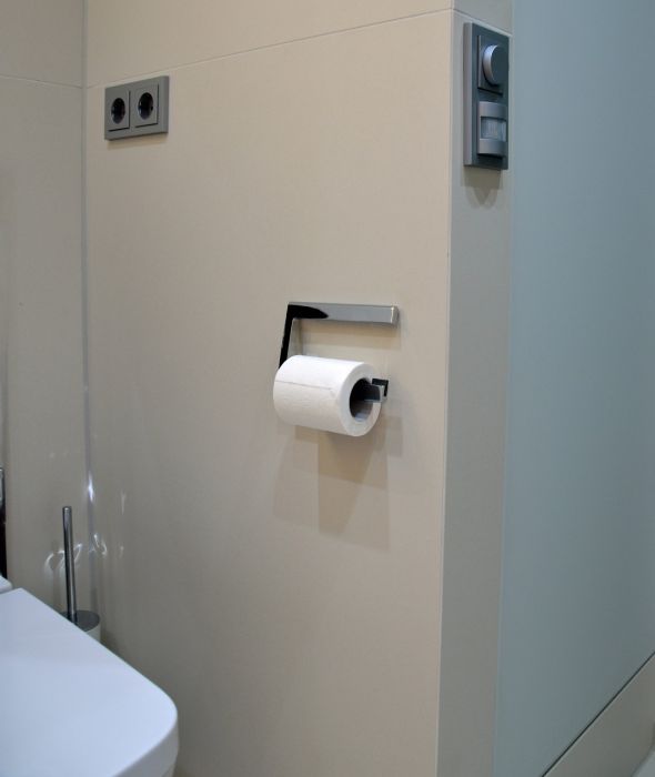 Das moderne Wasch-WC spendet tägliche Hygiene mit angeschlossenem Warmwasserkreislauf. Die schwarze Glasplatte ist nicht nur optisches Highlight, sondern bietet die Möglichkeit das WC unkompliziert in der Höhe verstellen zu können und für den täglichen Gebrauch eine integrierte Geruchsabsaugung. Ein sehr beliebten Detail da die verbrauchte Luft erst gar nicht in den Raum gelangt, sondern direkt über einen Aktivkohlefilter gesäubert wird – automatisch.