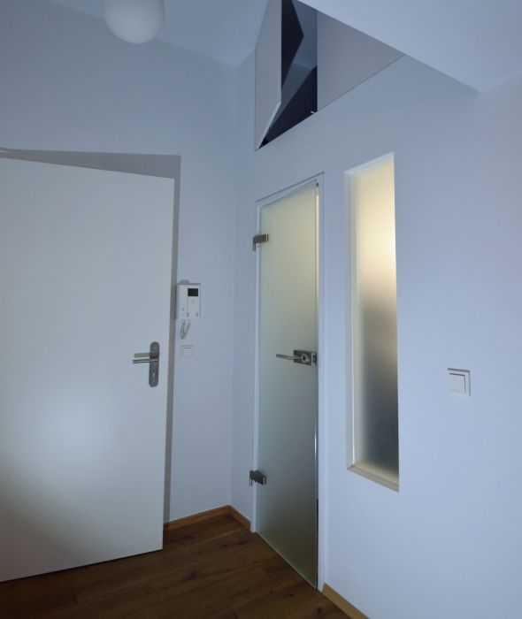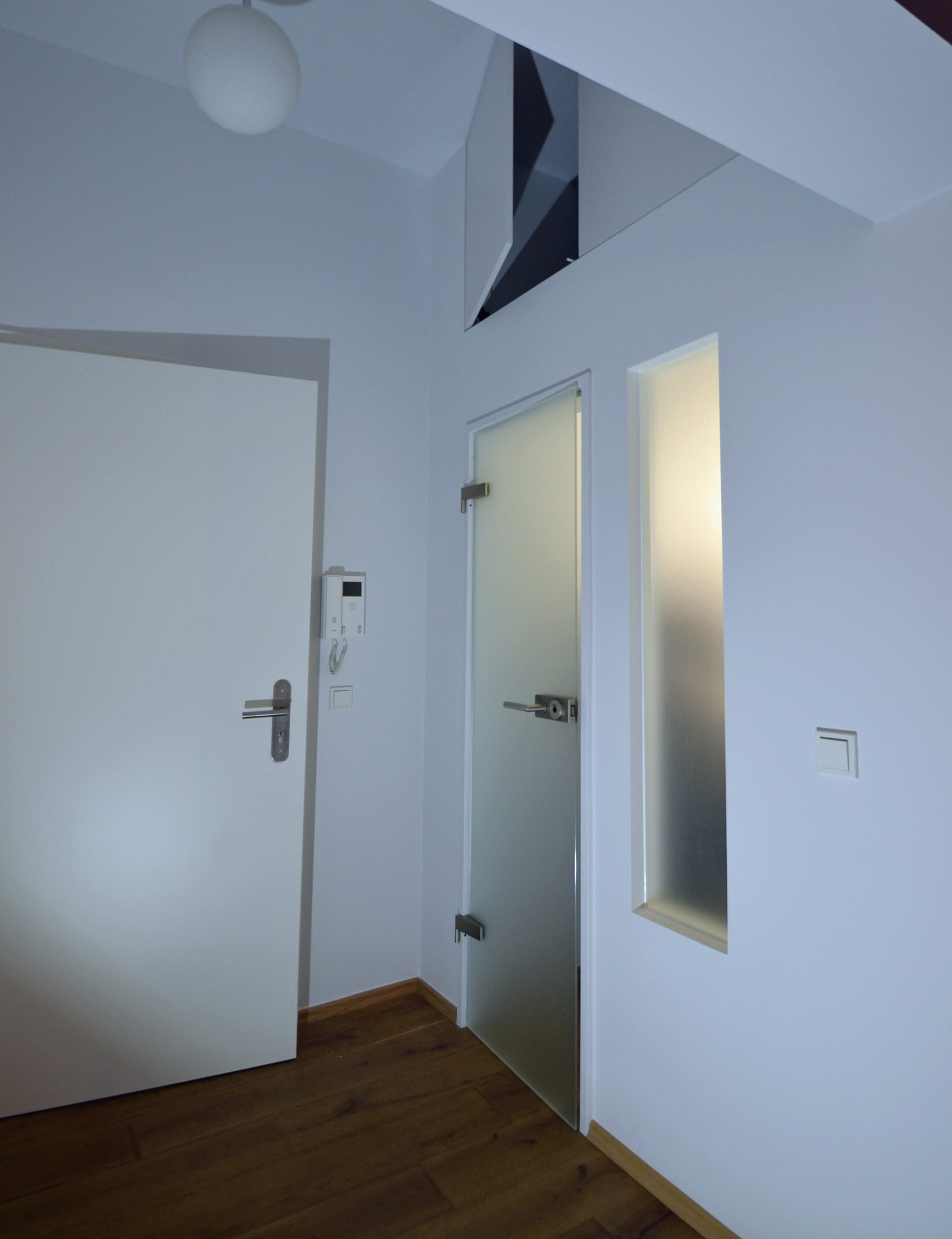 Von der Ecke aus, hinter der bislang die Garderobenecke untergebracht war, wird im Trockenbau eine neue Wand erstellt, die das künftige WC vom Vorraum abtrennt. In die Wand integriert sind eine satinierte Glastür sowie ein, ebenfalls satiniertes, Glasfenster. Beides erzeugt eine angenehm offene Wirkung und sorgt zugleich für ausreichend Intimität. Die Deckenhöhe von rund 320 cm ermöglicht es, einen zusätzlichen Stauraum über dem neuen Gäste-WC einzurichten: In Wandfarbe lackierte Holztüren verbergen hier zukünftig Koffer und Co.