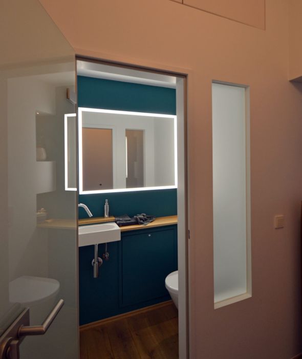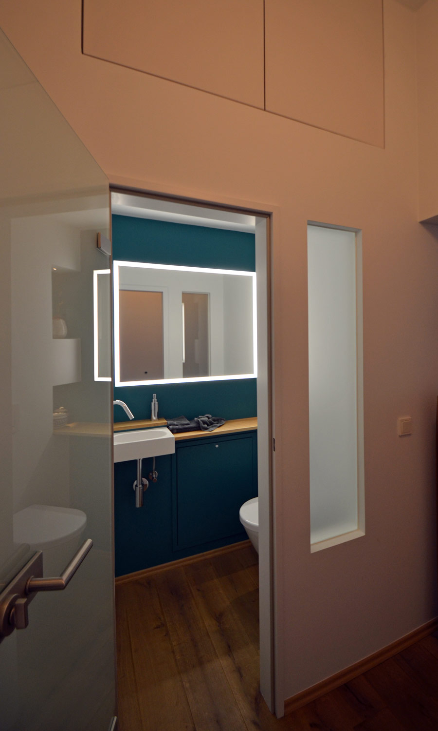 Die vorhandene Verkofferung inkl. Verteilung der Fußbodenheizung verändern wir in der Form, dass hinter und neben dem schmalen Handwaschbecken aus Ceramostahl speziell angefertigte Holzplatten für Ablagefläche sorgen. Die untere Holzablage wird passgenau in die untere Nische eingelegt und vermittelt dem kleinen WC-Räumchen neben komfortabler Ablagefläche für Gästetücher und Deko auch noch eine optisch großräumige Wirkung. Dies wird durch den großformatigen, rundum beleuchteten Spiegel zusätzlich unterstützt.