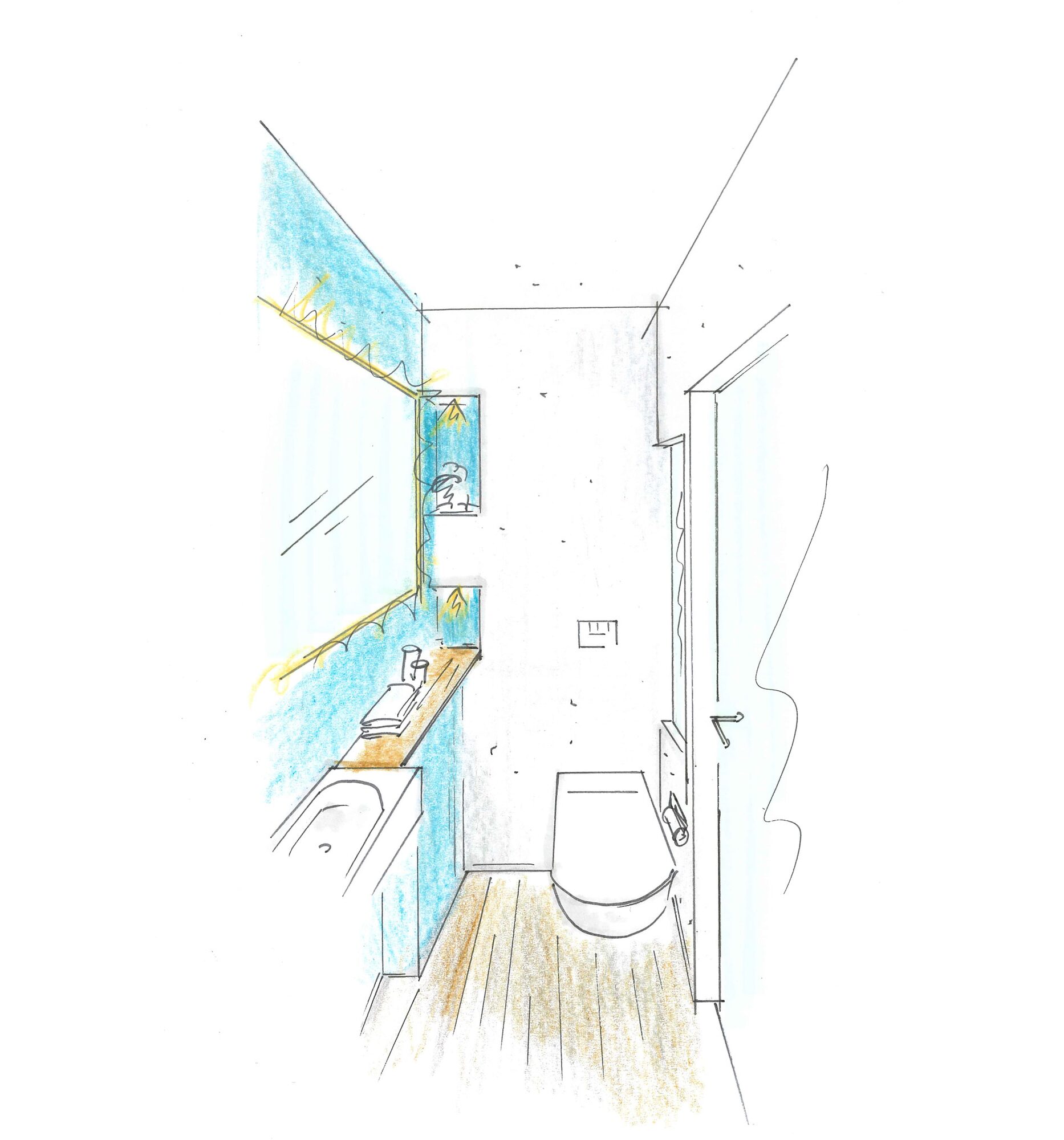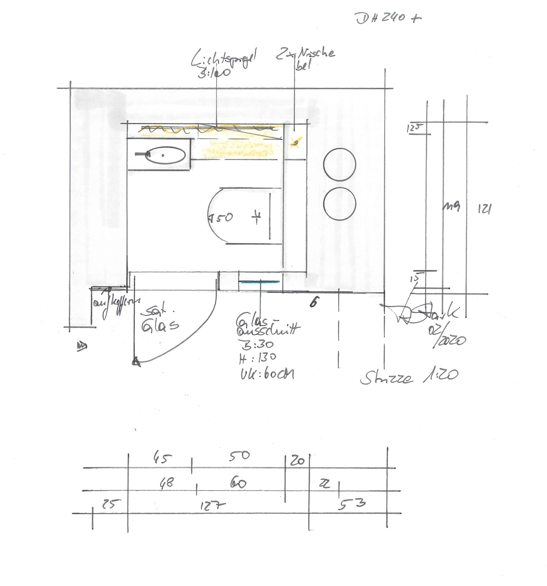 Während der Bauarbeiten stellt sich heraus, dass die rechte Kopfwand ausreichend Platz gewährt, um den Unterputzspülkasten und die beiden Wandnischen darin zu verstecken. Die so gewonnen 20 cm nehmen wir gerne zum Raum hinzu. Mit einer Kernbohrung schaffen wir die Anbindung an die Bestandsrohleitungen.